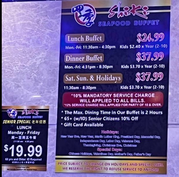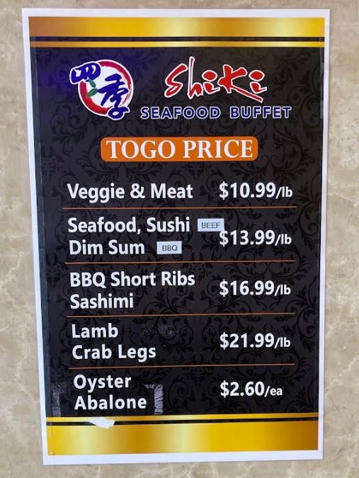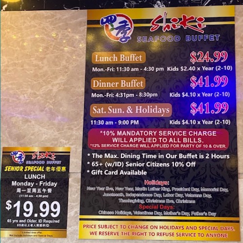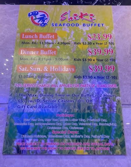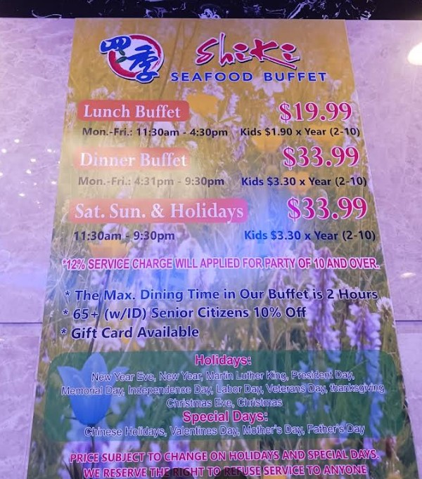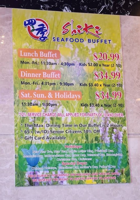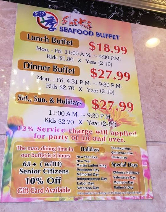 Went during weekday lunch, price per person is $24.99. They offer senior discount. Plenty of delicious choices for whatever you may be craving. Service is fast and friendly. The place can get crowded but plenty of tables and is kept clean. I recommend Shiki Seafood Buffet and will definitely be coming back for more.